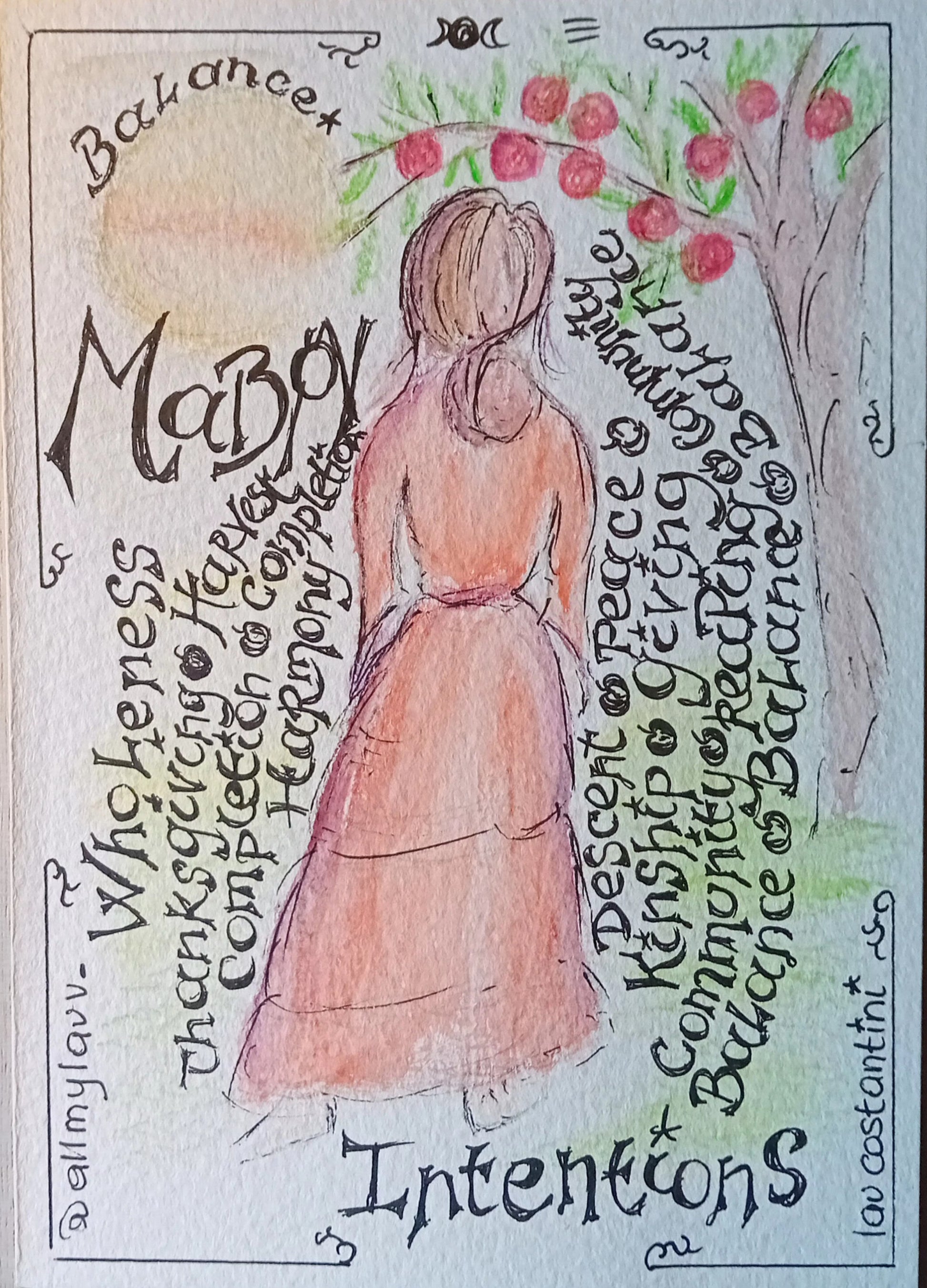 This piece is a gentle reminder of the intentions of Mabon: thanksgiving, abundance, balance, harmony, and the wholeness that comes when community and hard work bear fruit.