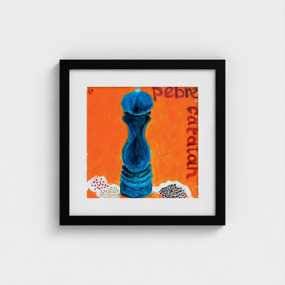“PEPPER” is a fine art paper print featuring a minimalist pepper mill and the inscription “Pebre Catalan.” Lighter and more graphic than its canvas counterpart, this version emphasises line, contrast, and the written word.